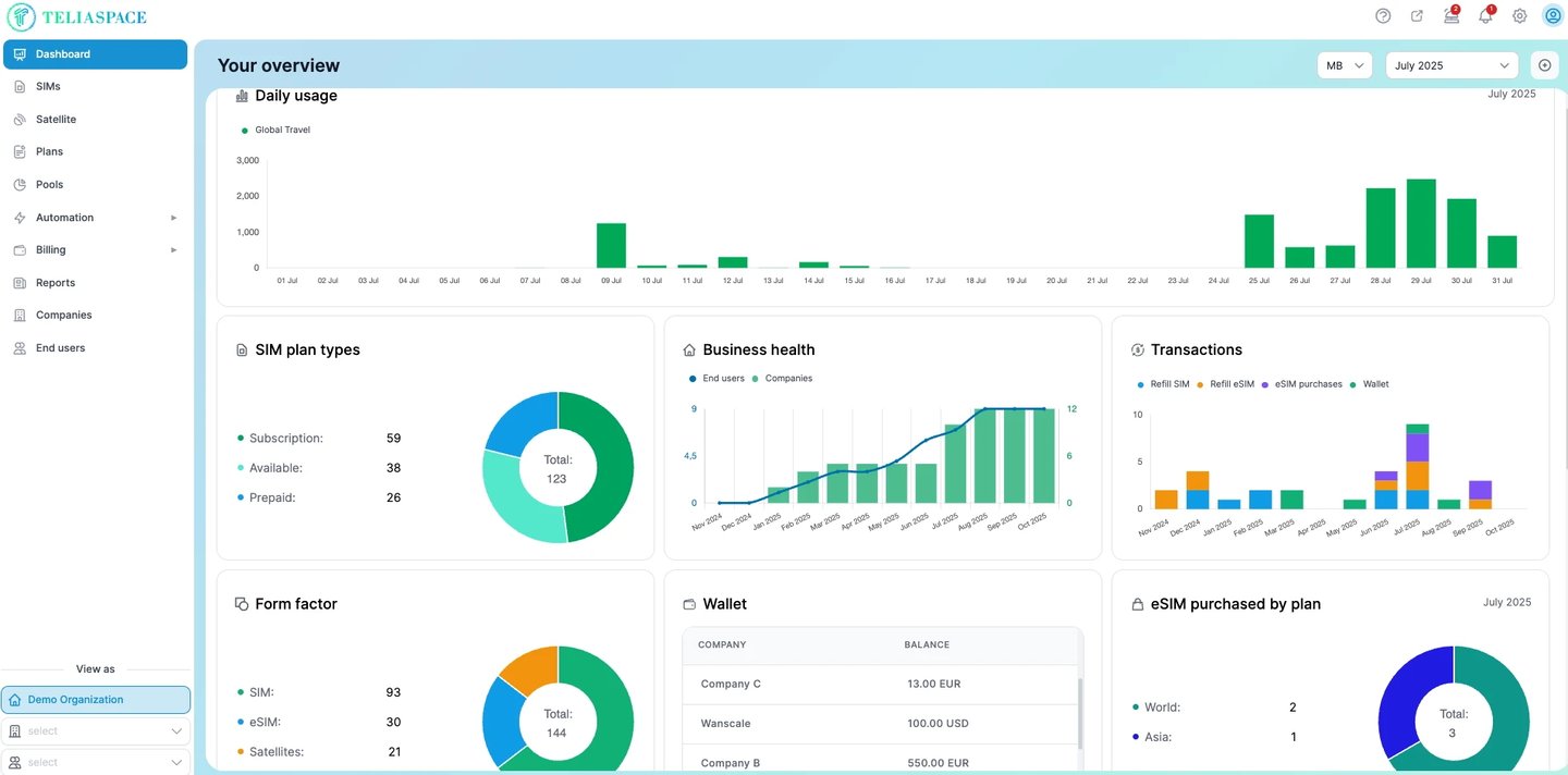 Our simple to use platform unifies SIM, eSIM, Satellite and IoT connections, giving you full control over usage, billing, and performance. With automation and multi-carrier support, you can easily manage global connectivity and monetize your network through flexible pricing and billing tools.