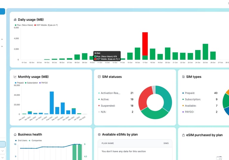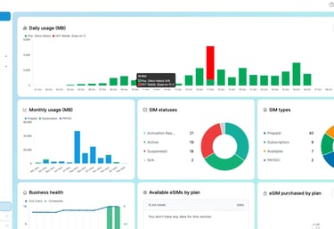 End-to-end SIM support for activation, troubleshooting, and customer assistance. Data plan configuration and pricing management. Invoicing and administration support for easy billing management.